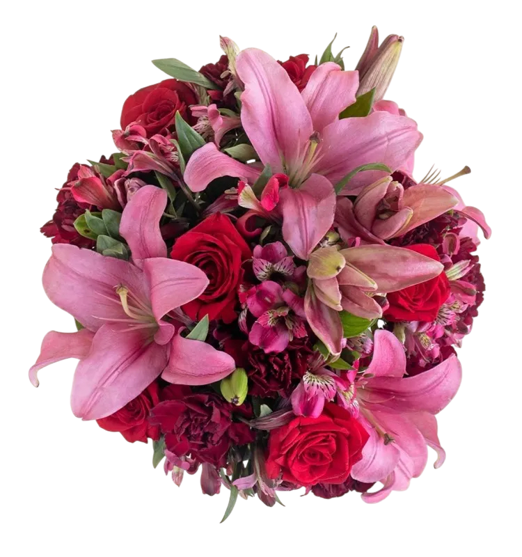 Jarron de rosas y lilys con alstroemerias (6 rosas rosas o rojas y 6 lilys)