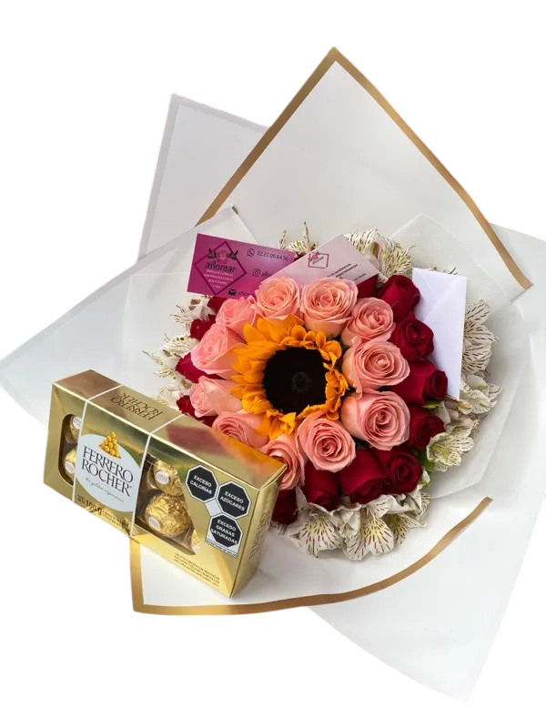 Ramo de rosa roja, rosas y alstroemerias con caja de Ferrero Rocher 🍫